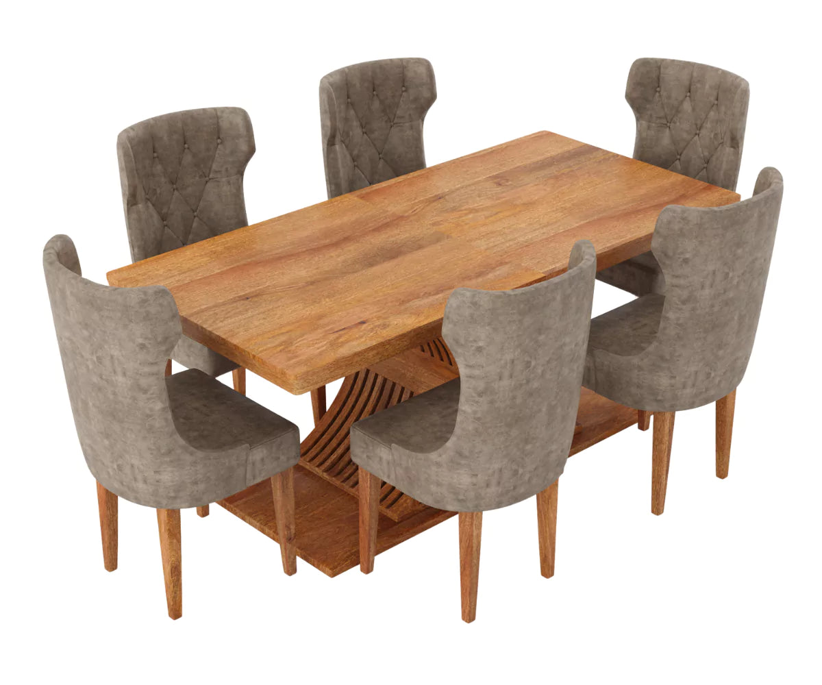 Crafted from premium mango wood, the Caelistra dining table boasts a robust build that promises durability and longevity. The chairs, upholstered in high-quality fabric, provide unrivaled comfort and elegance, making every meal a luxurious experience. The glossy finish adds a touch of sophistication, ensuring your dining room remains a focal point of aesthetic appeal.