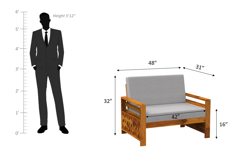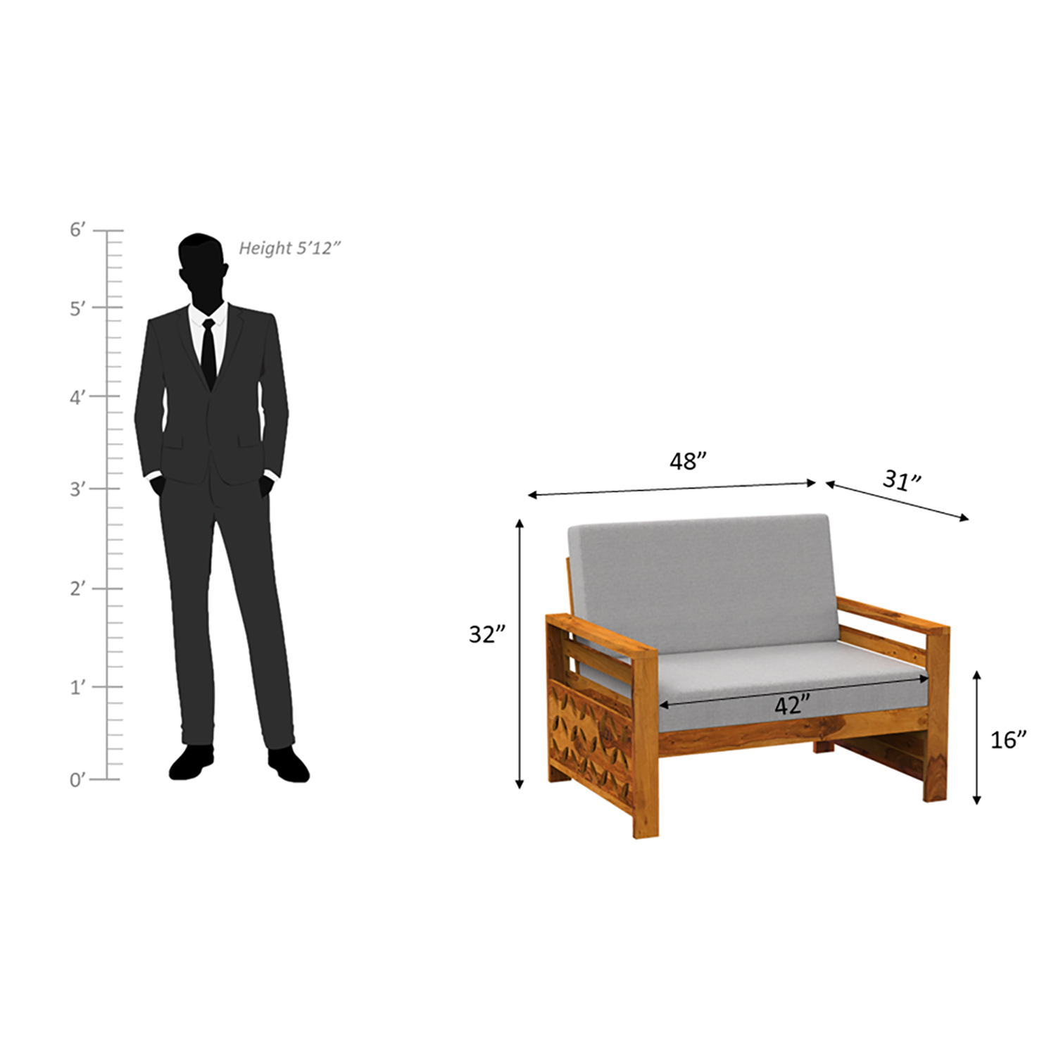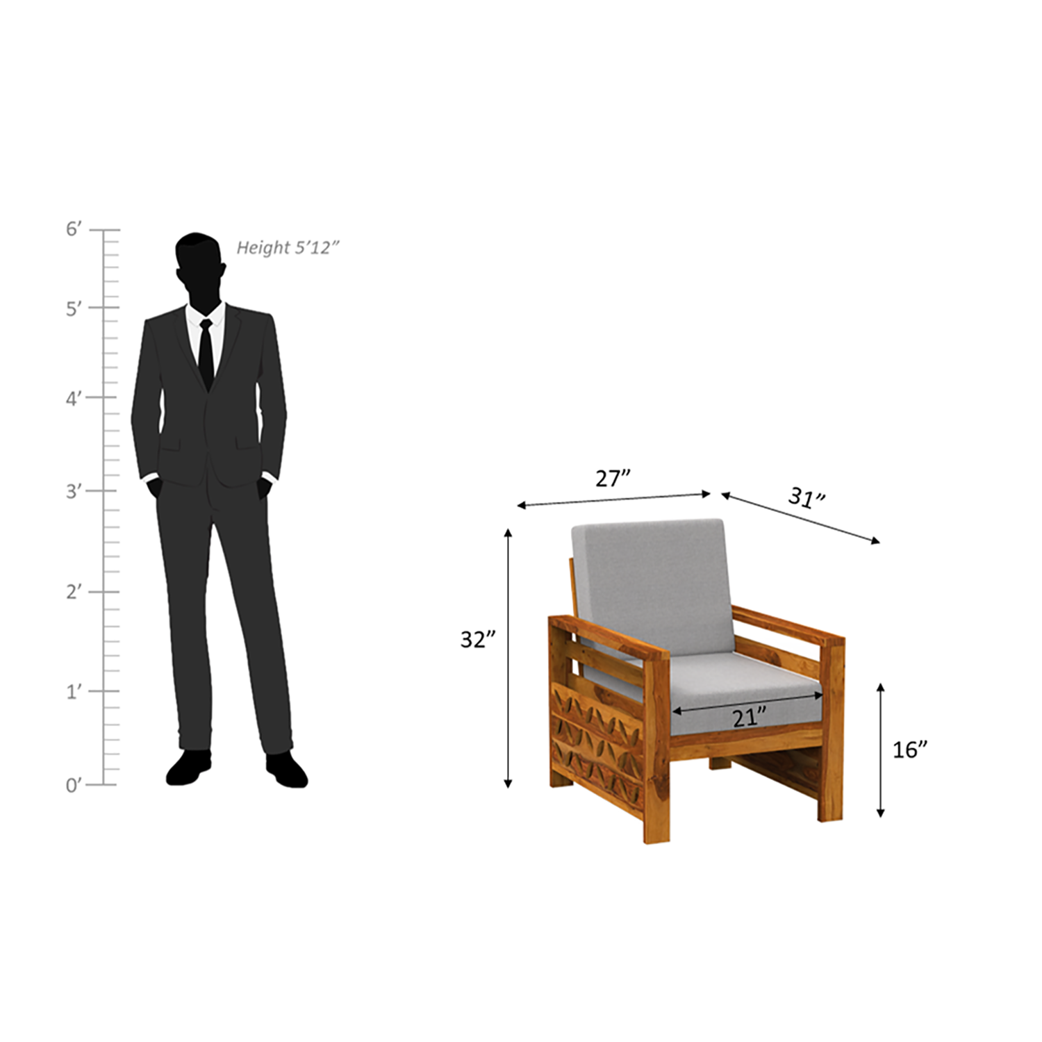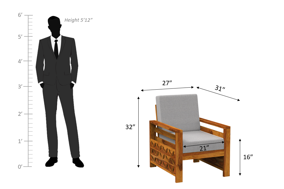 The dimensions of the Nirvana Wooden sofa 1 seater are Length 27 inches, Depth 31 inches, Height 32 inches, and SEATING HEIGHT 16 inches.