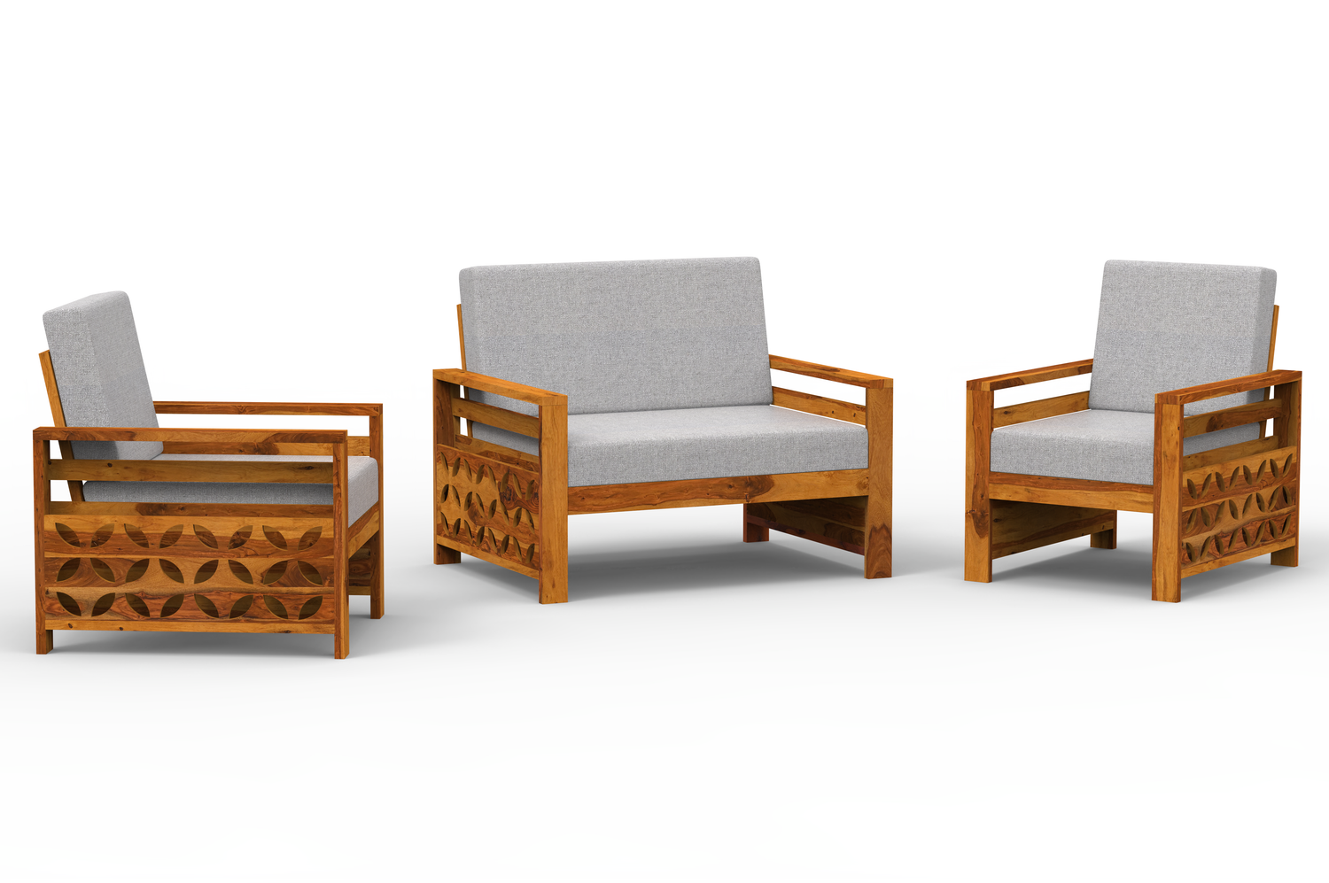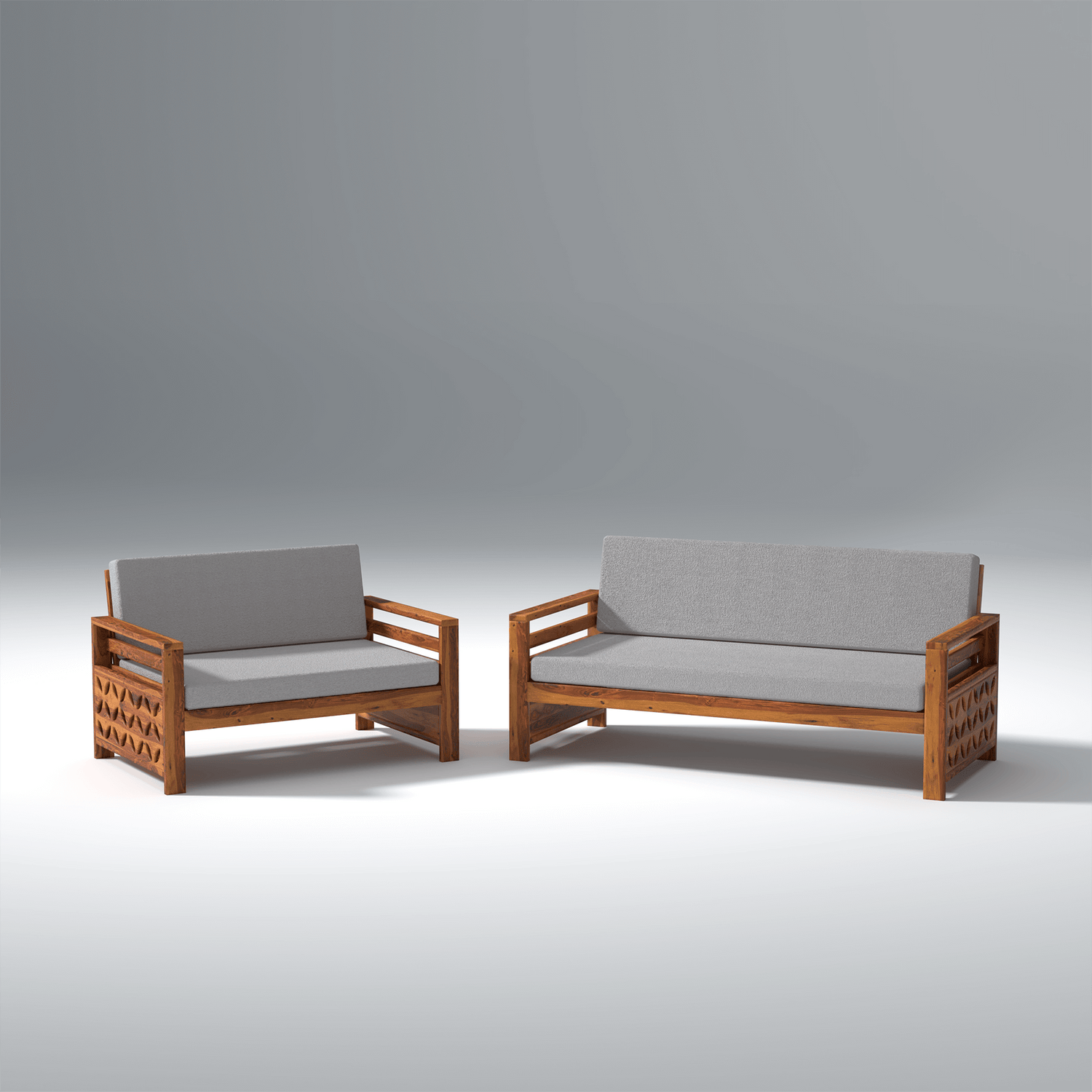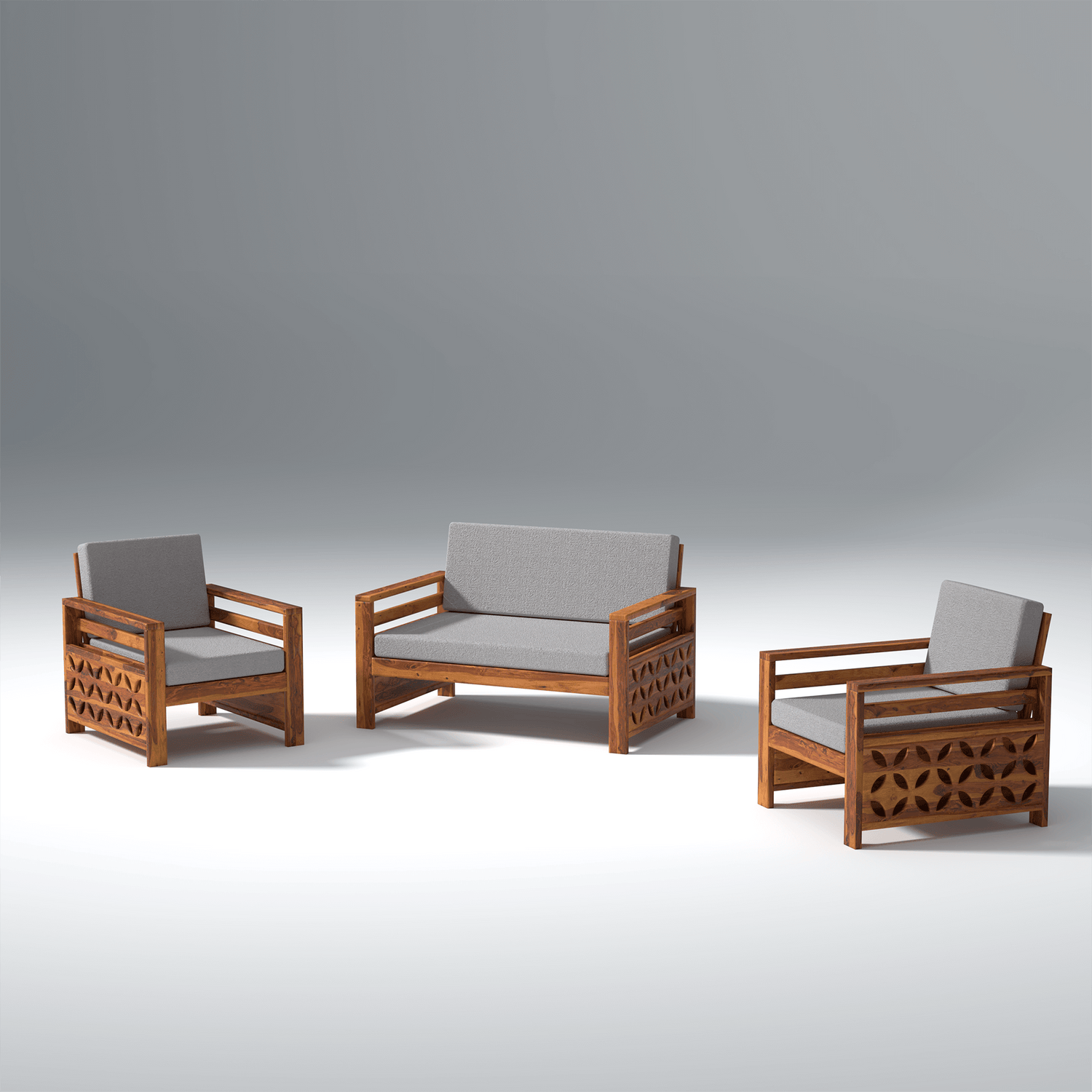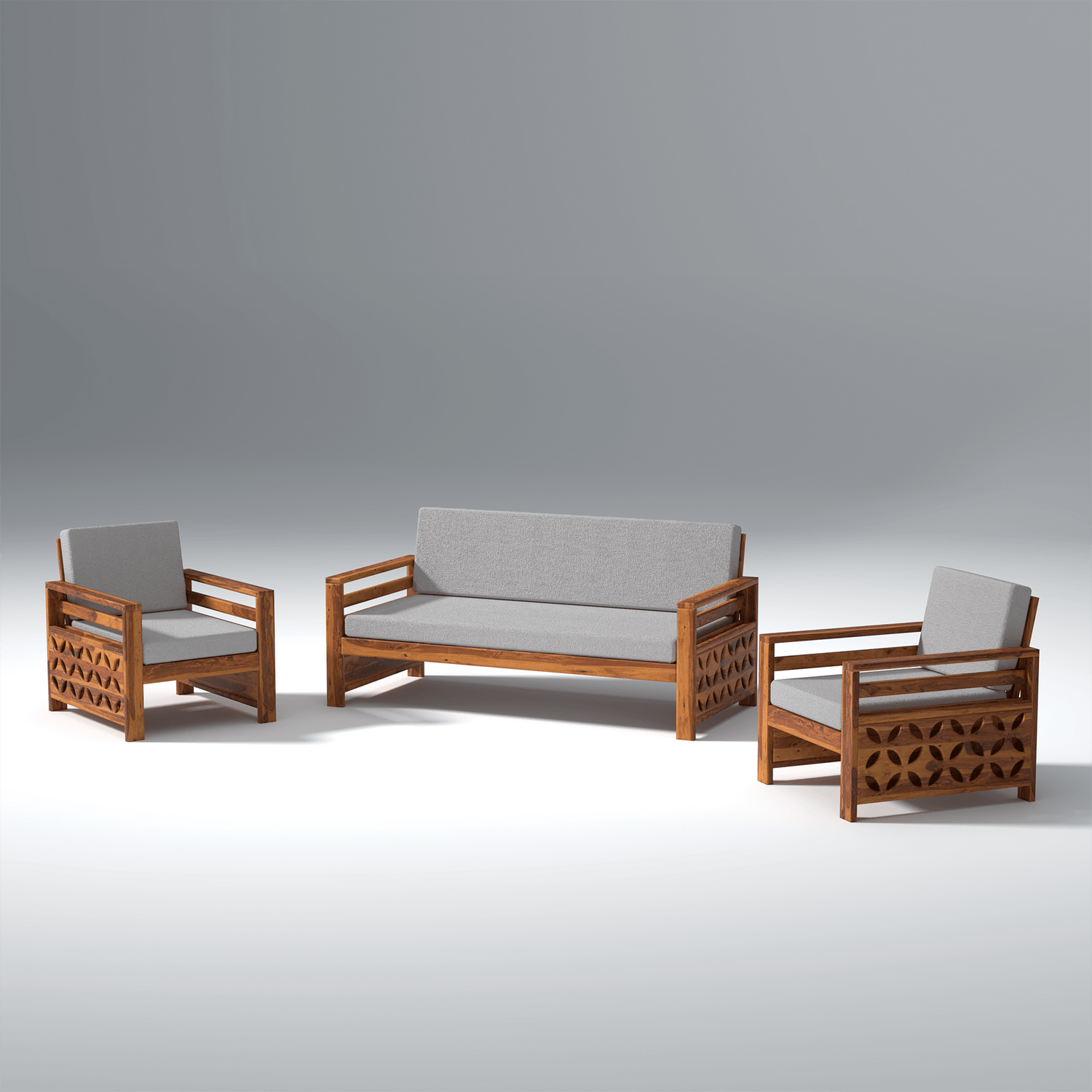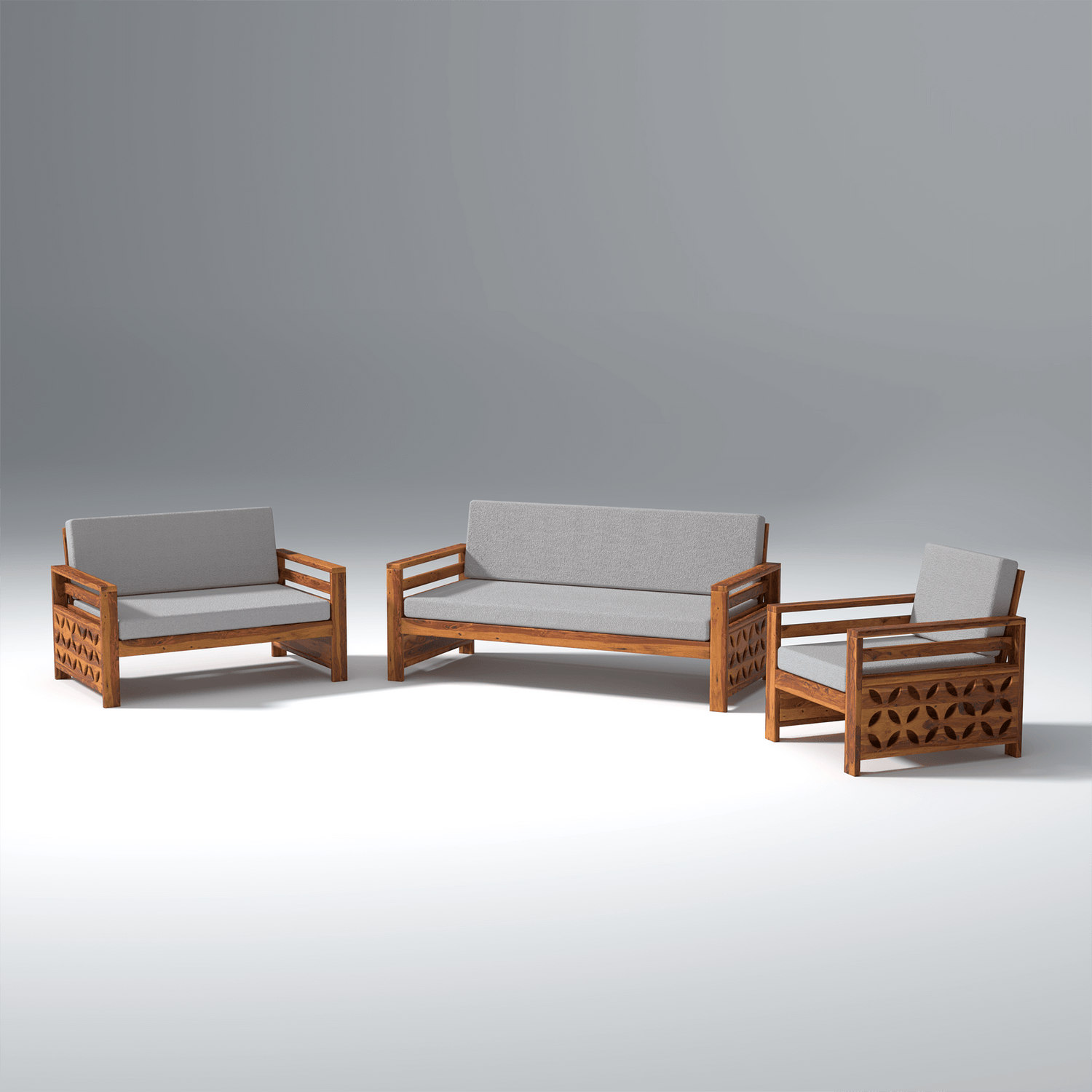 The Nirvana Wooden sofa set, comprising of a 2-seater, 1-seater, and another 1-seater, offers a versatile and comfortable seating arrangement for your living space.