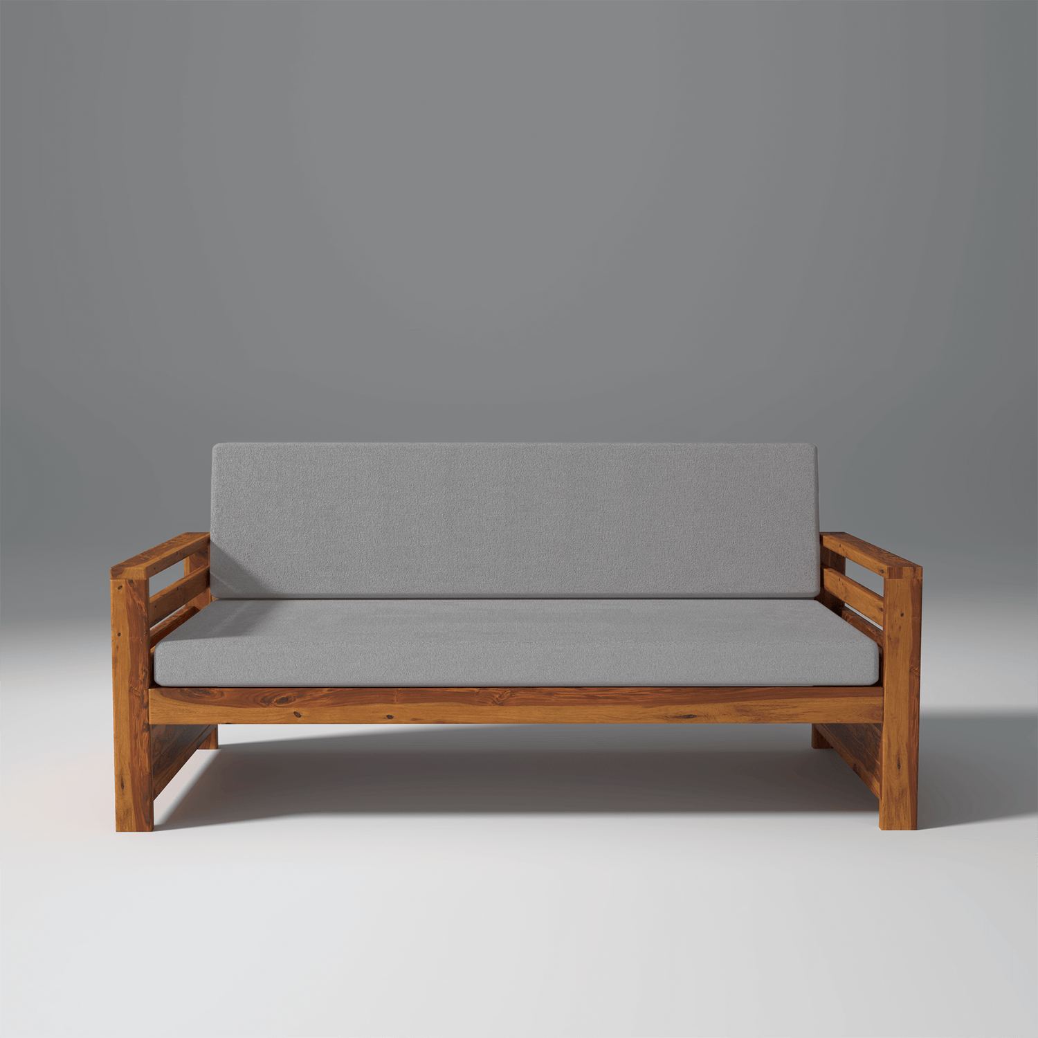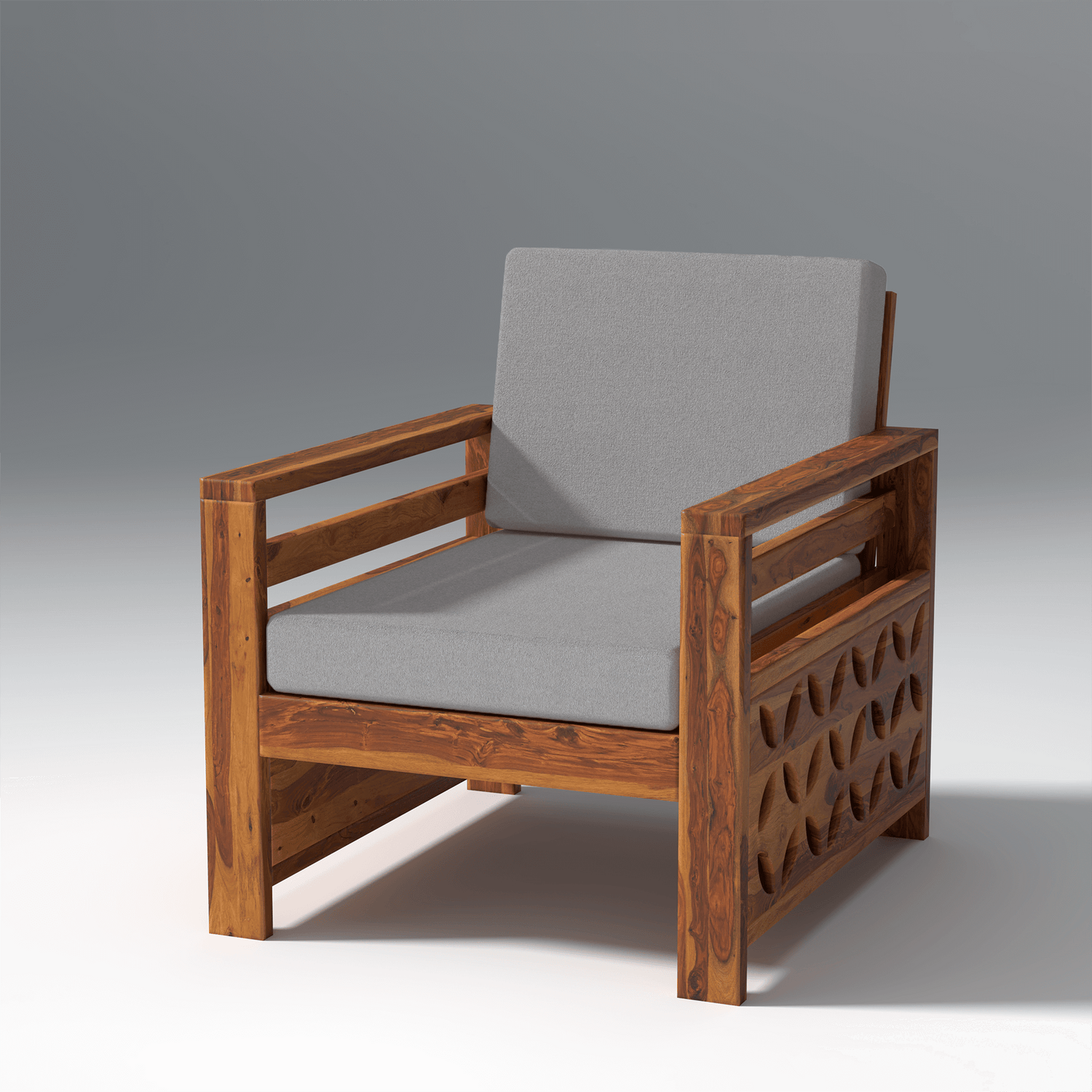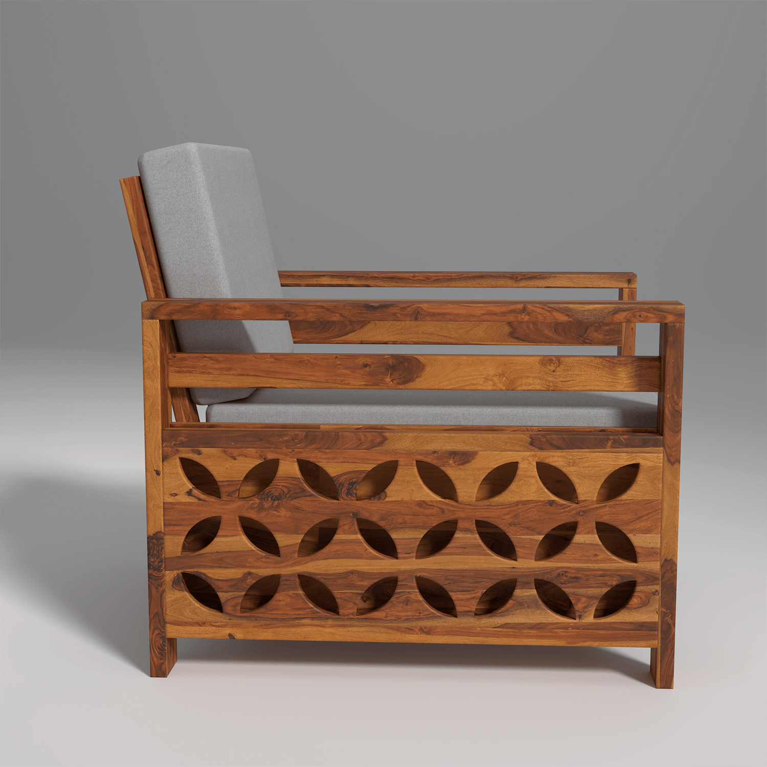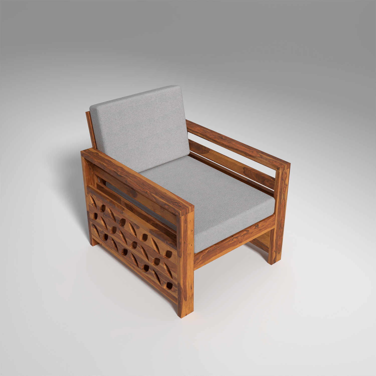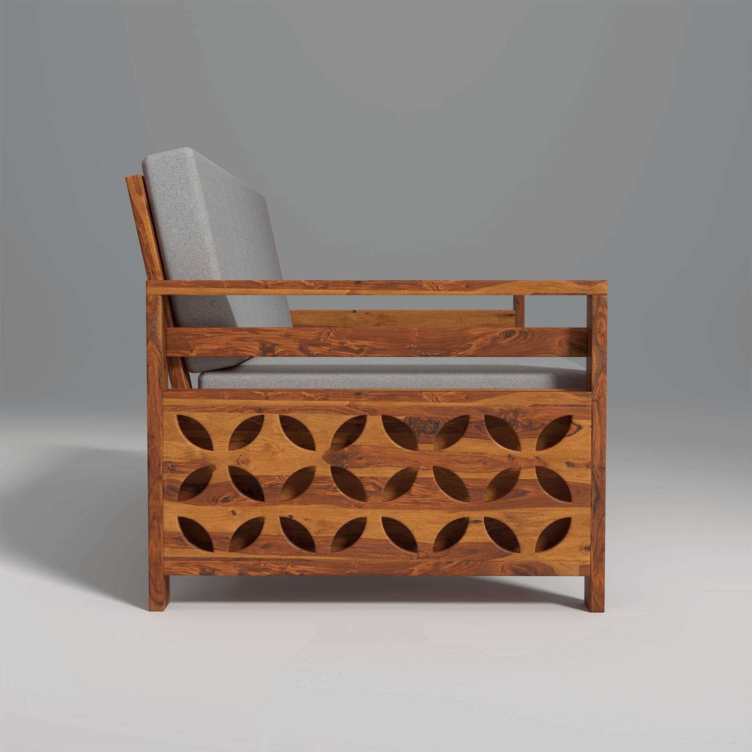 The Nirvana Wooden sofa set, comprising of a 2-seater, 1-seater, and another 1-seater, offers a versatile and comfortable seating arrangement for your living space.