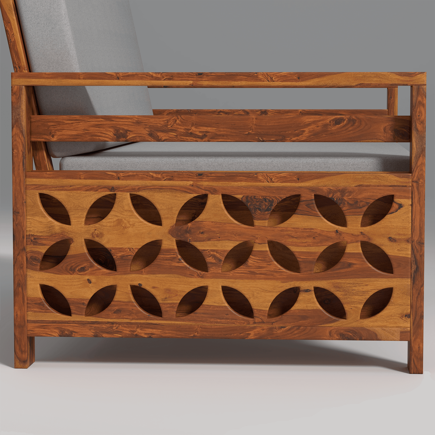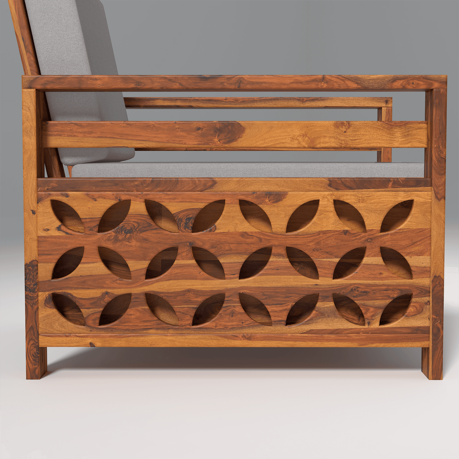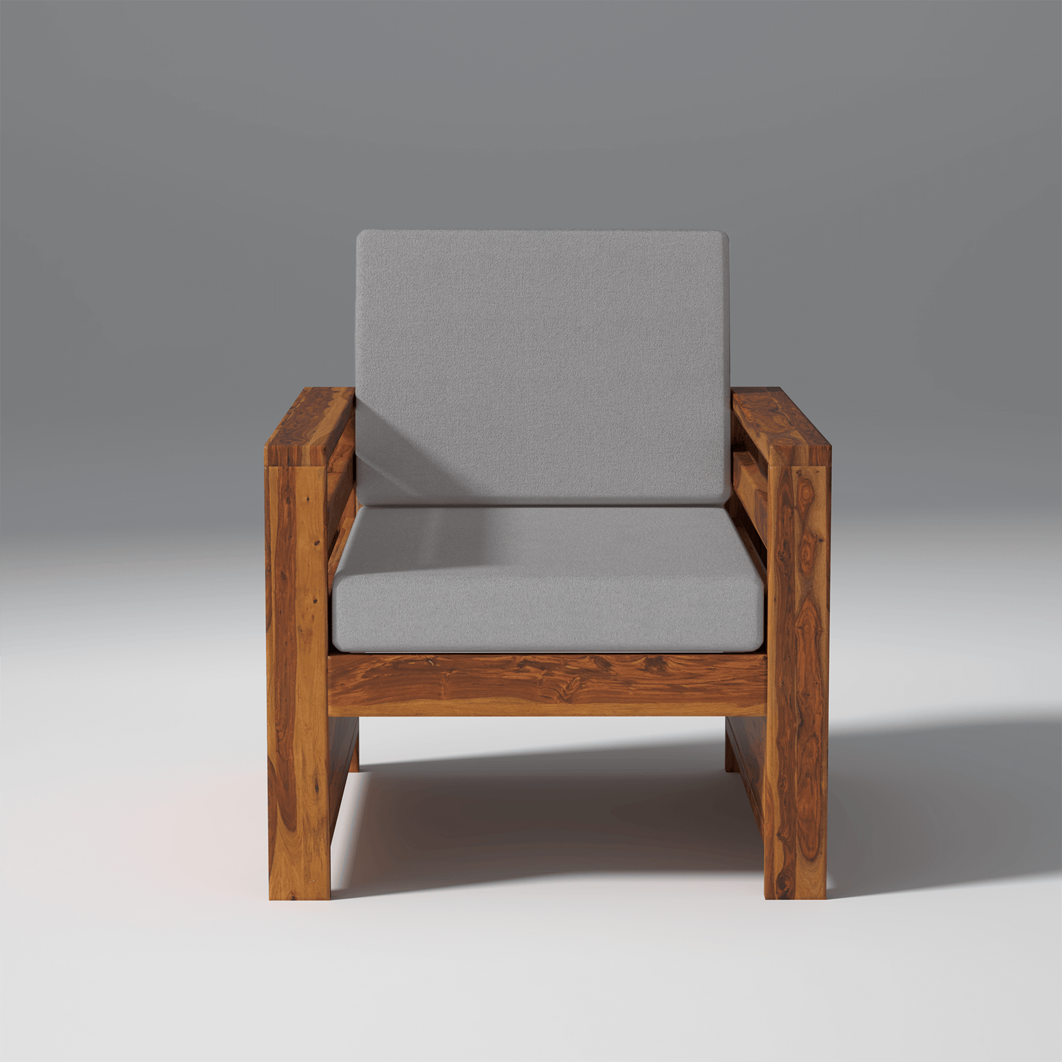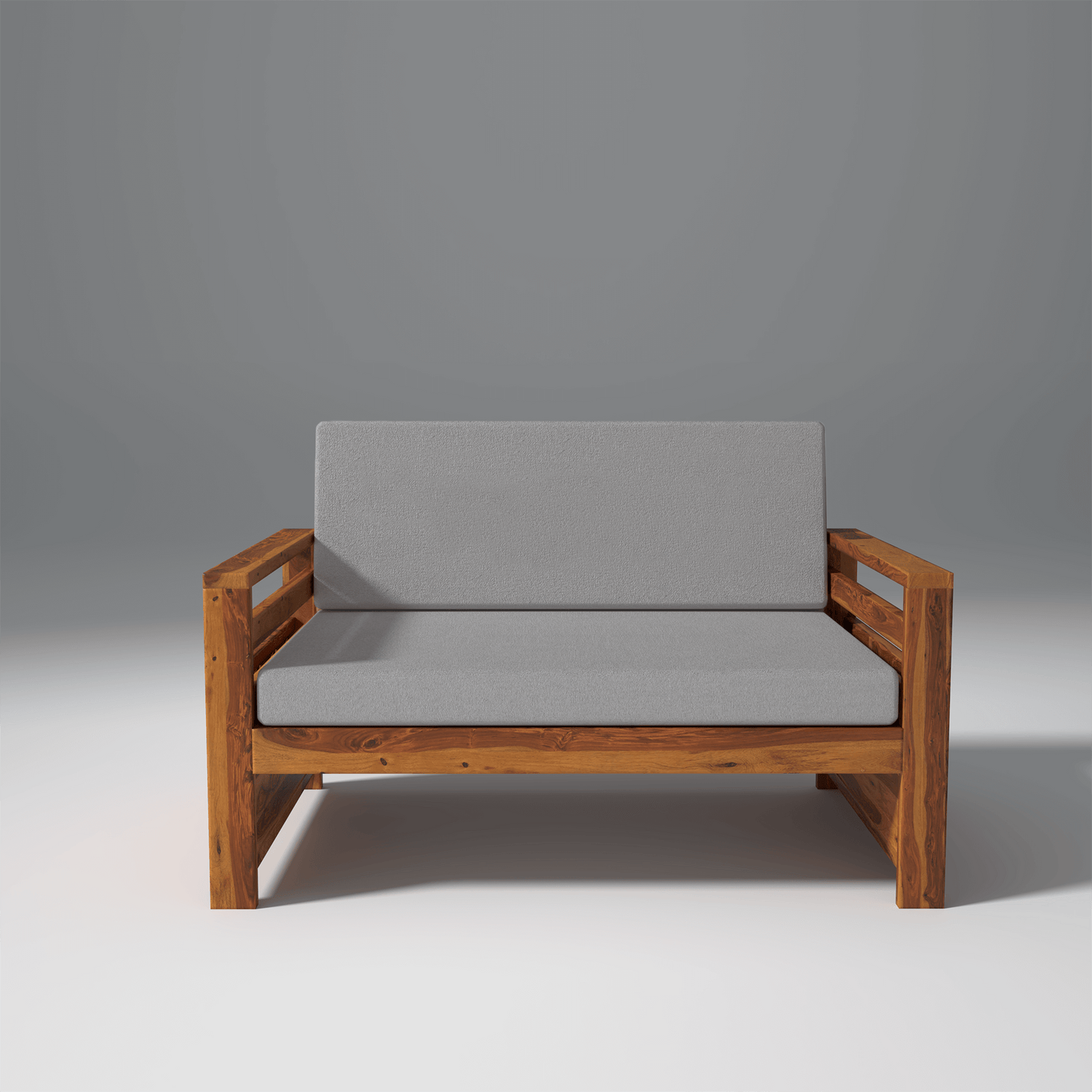The Nirvana Wooden sofa 1 seater is a stylish and comfortable addition to your living space and bedroom. This sofa features a solid Sheesham wood frame and plush cushions for optimal support and relaxation. Its sleek design and high-quality materials ensure durability and a touch of elegance, making it a perfect choice for creating a cosy corner in your room.