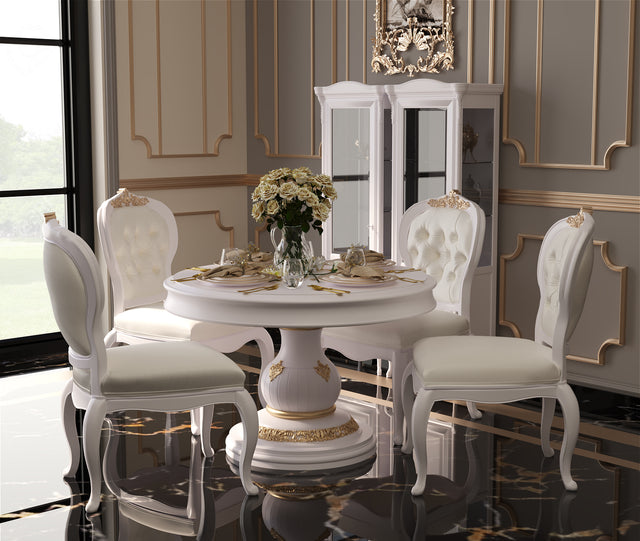 Unmatched Elegance: With its round pedestal dining table and beautifully crafted upholstered chairs, this set exudes a royal charm that elevates your dining experience. It’s not just furniture; it’s a statement of luxury and style.