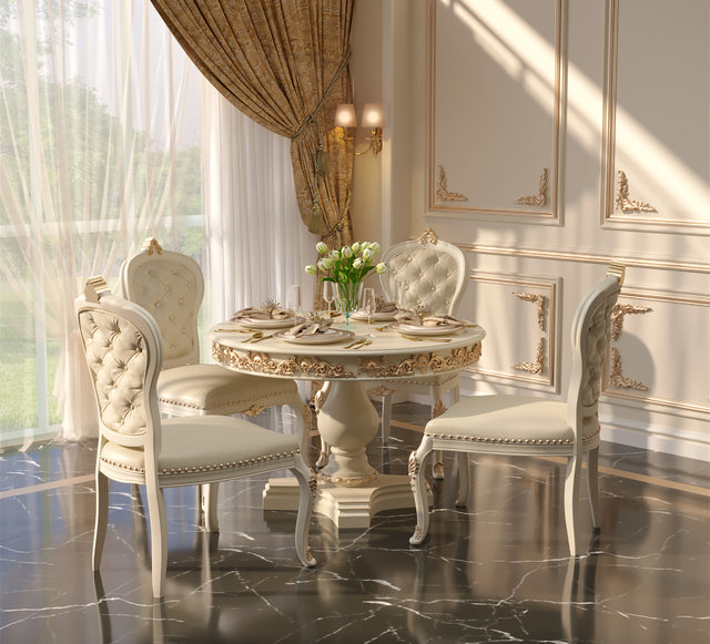 Introducing the epitome of dining elegance – the Zyvra Luxury Solid Wood Round Dining Set. This exquisite collection is a testament to timeless design, blending the robustness of solid wood with the intricate beauty of gold color carving work. Available in a selection of sophisticated hues – white, beige, and black – this dining set is designed to complement any decor style, making it a perfect centerpiece for your dining room.