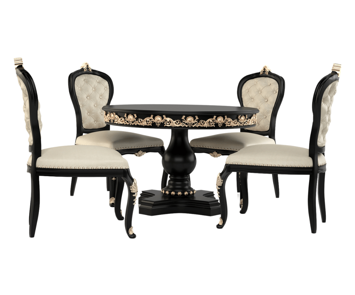 Experience true luxury with the finely crafted Zyvra Dining Set. The solid wood construction assures long-lasting durability, while the gold carving work adds an element of refined grace. With its upholstered chairs, this dining set promises comfort that matches its elegance, making every meal a luxurious experience.